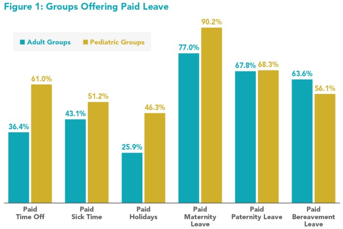 The 2025 State of Hospital Medicine (SoHM) Report, however, found that only about a third of adult hospitalists received PTO, which is only a slight increase from the 2023 SoHM. The 2025 SoHM Report additionally explored the various types of paid leave offered to adult and pediatric groups and found that adult groups are trailing pediatric groups in offering paid leave (see Figure 1 above).